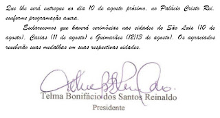 Temos a grata satisfação de enviar-lhe, em anexo, o oficio comunicando a outorga da Comenda “Gonçalves Dias” para Vossa Senhoria, por ocasião do lançamento dos “Mil Poemas Para Gonçalves Dias” e comemoração dos 190 anos do Poeta, no dia 10 de agosto de 2013, às 19h20min, no auditório dos Colegiados Superiores do Palácio Cristo Rei, situado na Praça Gonçalves Dias, 351, Centro, São Luís/MA, conforme programação, também, em anexo.
